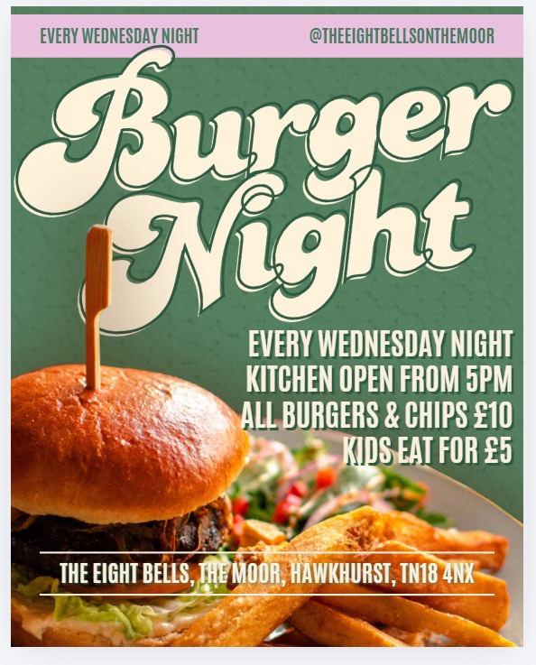 Join us every Wednesday for Burger Night at The Eight Bells. Choose from a delicious range of freshly prepared burgers and chips for just £10. And for the little ones, kids eat for only £5.
